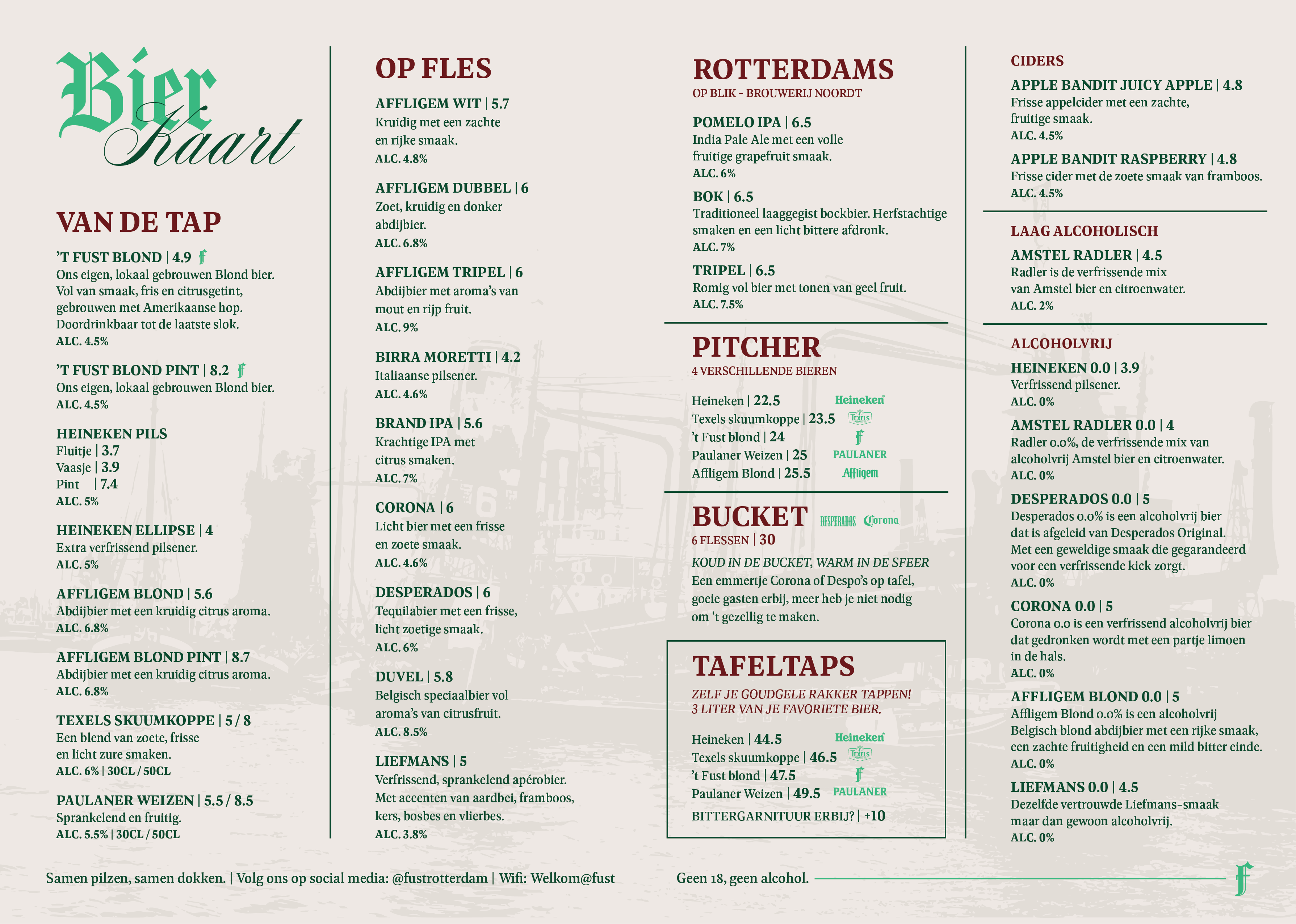 Bij ’t Fust gaat een goed glas bier natuurlijk hand in hand met lekker eten. Van stevige klassiekers tot borrelhapjes om te delen—hier vind je altijd iets naar je smaak. Zin in een malse saté, een goedgevulde burger of gewoon een portie bitterballen bij je borrel? Ons menu is recht voor z’n raap, zonder poespas, maar altijd lekker. Kom langs en proef het zelf, met een beetje echte Rotterdamsche gezelligheid!